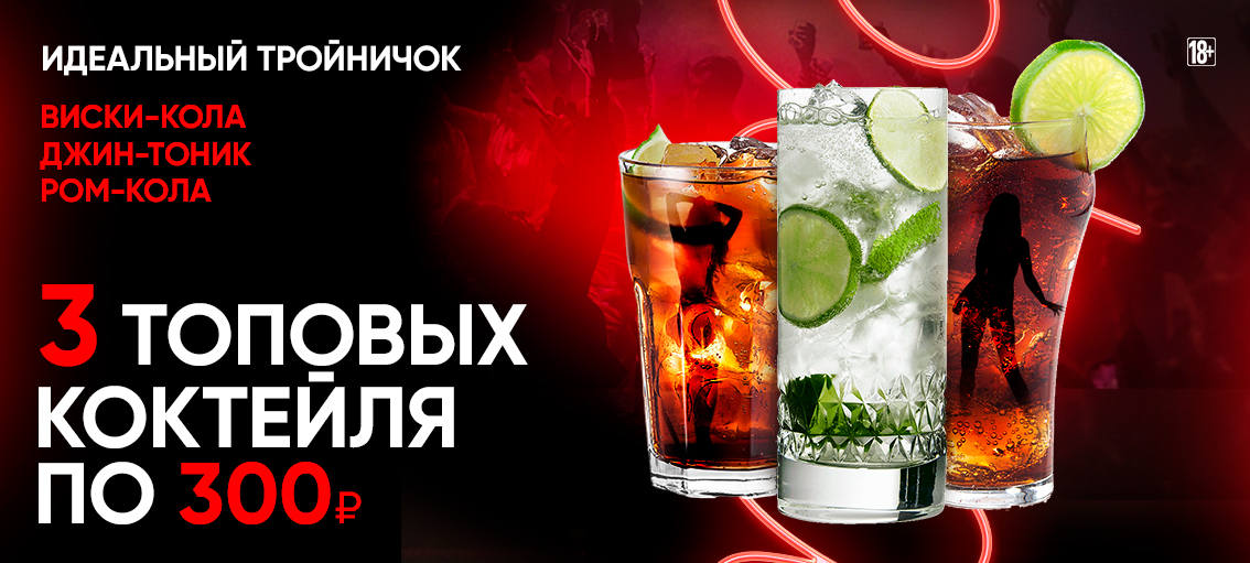 Три самых топовых коктейля всего по 300 рублей до 00:00 — каждый день без ограничений!